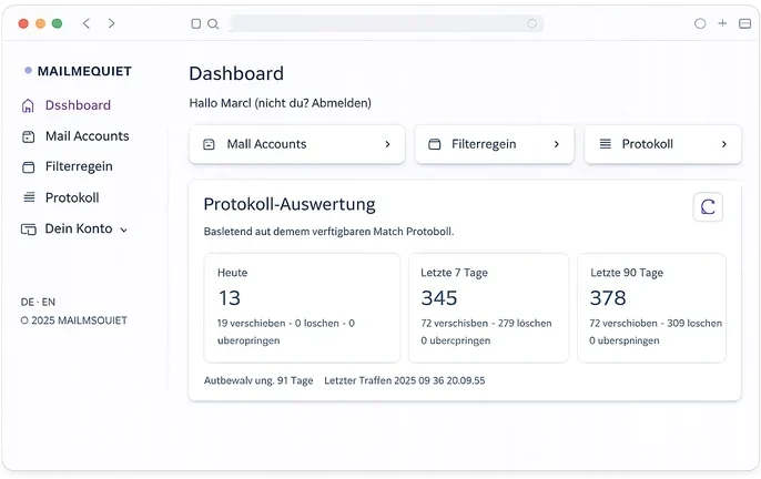 MailMeQuiet filtert, sortiert und beruhigt deinen E-Mail-Strom – bevor du ihn überhaupt siehst.